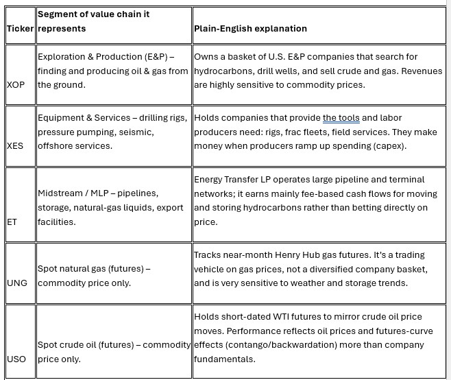 Think of the oil & gas chain as: find it → drill it → move it → sell/consume it, with separate “price‑only” tools (USO, UNG) for pure commodity bets.