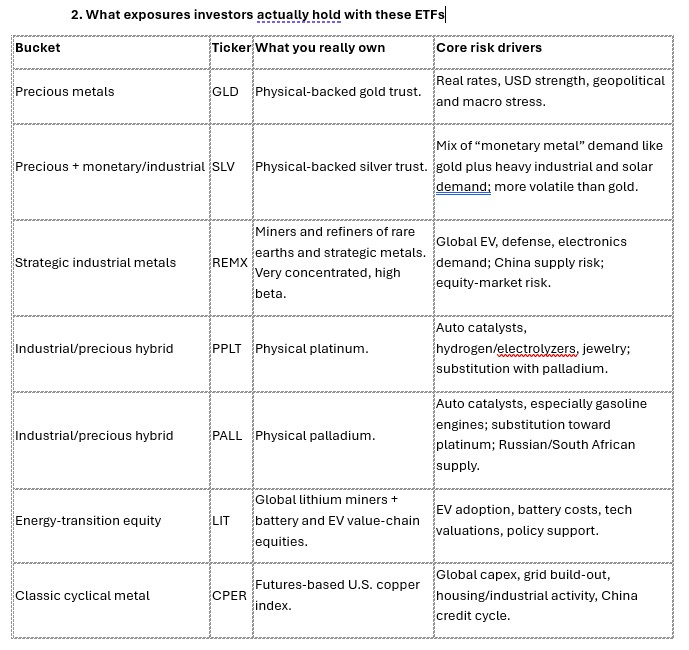 • LIT (lithium & battery tech): Also participated in the metals‑plus‑electrification trade, with strong 2025 performance tied to EV and storage demand; it shows up on “hottest ETFs of 2025” lists, though with more stock‑specific and tech risk than pure metal trusts.